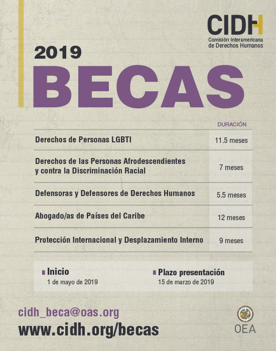 § Beca sobre los Derechos de las Personas Afrodescendientes y contra la Discriminación Racial (7 meses) § Beca sobre Defensoras y Defensores de Derechos Humanos (5.5 meses) § Beca para Abogado/as de Países del Caribe (12 meses) § Beca sobre Protección Internacional y Desplazamiento Interno (9 meses) |