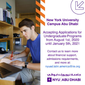 El Instituto de Educación Internacional (IIE) está trabajando en asociación con la Universidad de Nueva York para identificar estudiantes talentosos de todo el mundo para asistir a la Universidad de Nueva York en Abu Dhabi. NYU ha diseñado un nuevo modelo visionario para la educación superior en la encrucijada del mundo-Abu Dhabi-combinando lo mejor de una educación universitaria de investigación con la ventaja de un programa de artes liberales, ciencias e ingeniería.