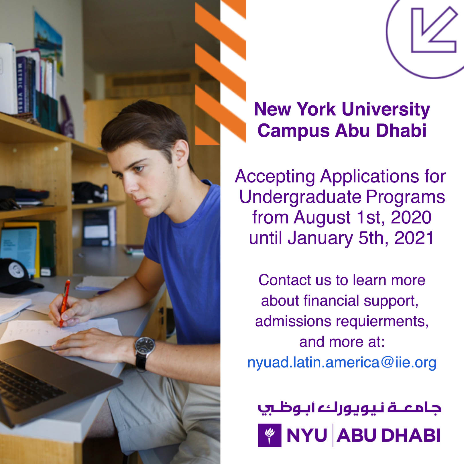 La charla virtual estará enfocada en compartir las oportunidades que ofrece la red global de NYUAD para quienes estén interesados en estudiar en este campus. Durante esta presentación que se realizará el lunes, 17 de agosto de 4 – 5 PM horario de Ciudad de México (3 – 4 PM horario de Guatemala), también se responderán preguntas en vivo sobre el proceso de solicitud de ingreso a NYUAD, Interesados registrarse a través del siguiente link: https://connect.nyu.edu/register/?id=08ca9a8e-038b-43a5-8963-1d0af4c5f0bb (ver afiche adjunto)