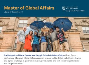 El Master of Global Affairs (Máster en Asuntos Globales) es un post-grado, profesional, a tiempo completo de University of Notre Dame’s new Keough School of Global Affairs. El programa incluye cuatro semestres más el verano entre el primer y segundo año.