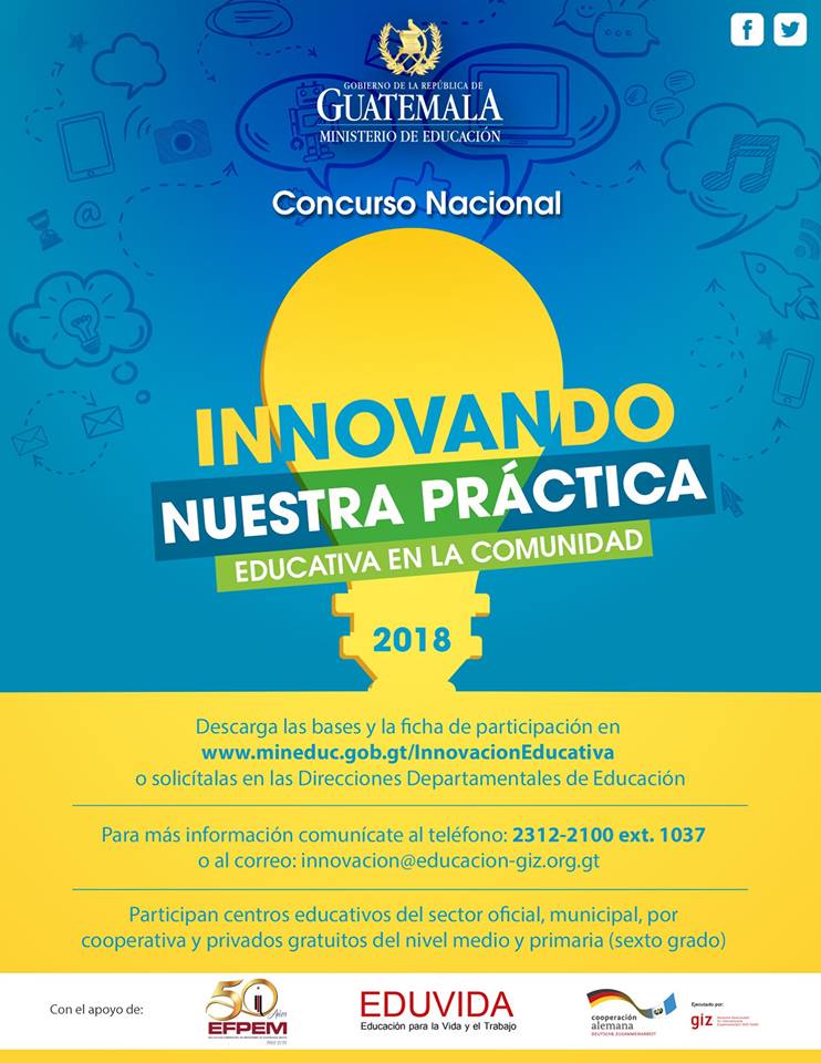 El Ministerio de Educación de Guatemala -MINEDUC-, con el apoyo de la Escuela de Formación de Profesores de Enseñanza Media -EFPEM- de la Universidad de San Carlos de Guatemala -USAC- y del Programa de Educación para la Vida y el Trabajo -EDUVIDA- II de la Cooperación Técnica Alemana -GIZ-, convocan al Concurso Nacional “Innovando nuestra práctica educativa en la comunidad”, con el propósito de reconocer a centros educativos del sector oficial, municipal, por cooperativa de enseñanza y privados gratuitos del área rural y urbana de todo el país, que presenten innovaciones educativas y de gestión institucional que vinculen valores, conocimientos, saberes o experiencias de la comunidad; estrategias de gestión y de aprendizaje. Así también, se busca estimular a los directores y docentes a continuar innovando.