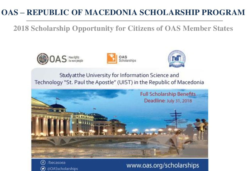 La Organización de Estados Americanos (OEA), a través del Departamento de Desarrollo Humano, Educación y Empleo (DHDEE) y la República de Macedonia, a través del Programa de Alianzas de la OEA para la Educación y Capacitación (PAEC), están ofreciendo becas a candidatos calificados de las Américas para proseguir estudios universitarios de nivel licenciatura en idioma inglés en la Universidad de Ciencias de la Información y la Tecnología «St. Pablo Apóstol «(UIST).