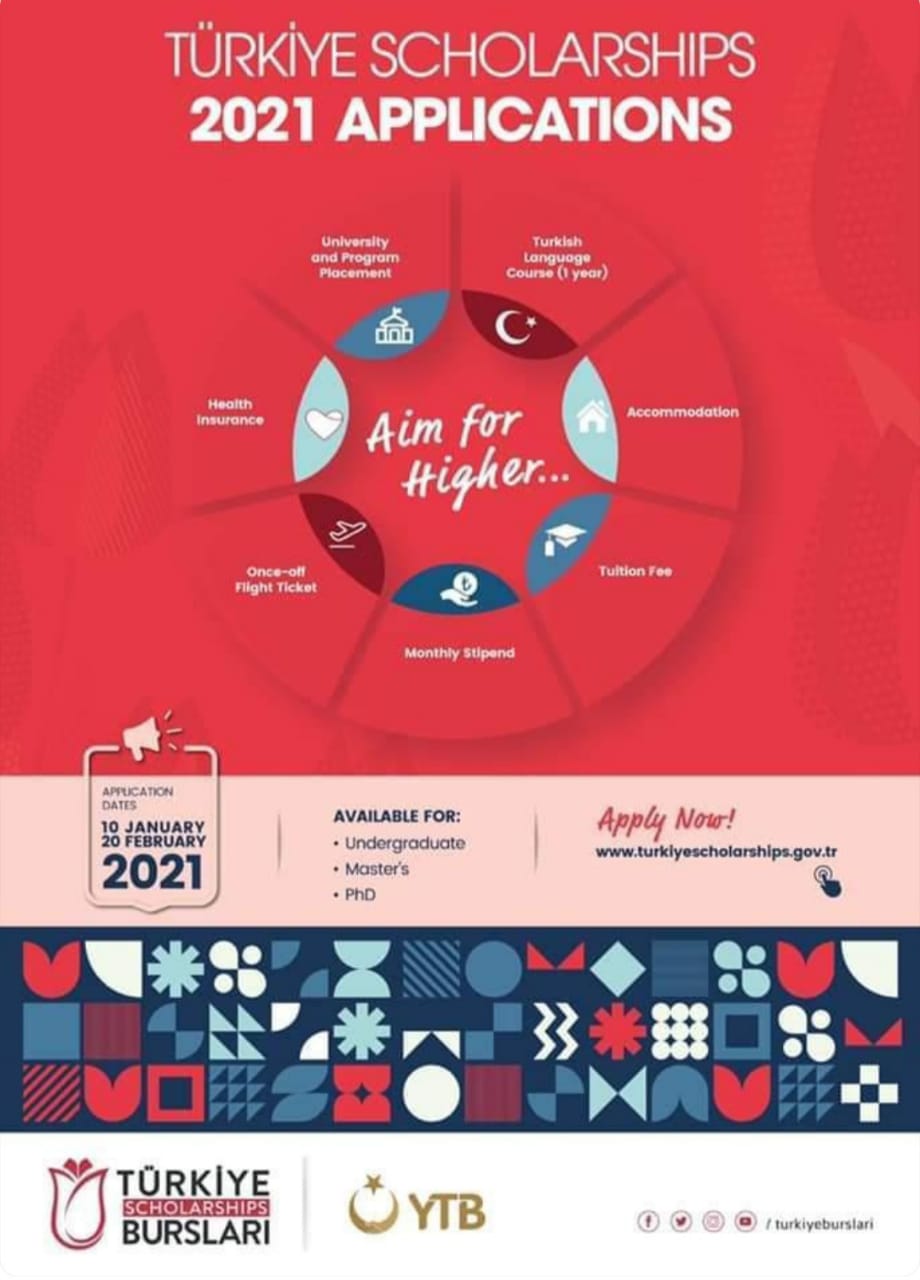 Las solicitudes de Becas Türkiye para 2021 se recibirán en un período, y las solicitudes estarán abiertas entre el 10 de enero y el 10 de febrero de 2021 para estudiantes internacionales de todos los países.